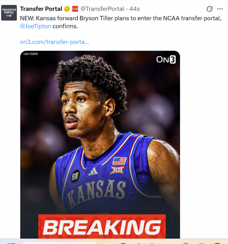 Kansas Power Forward Bryson Tiller to the portal. Started 31 games for the Jayhawks averaged 8ppg and 6rebs as a freshman could be primed for a big jump in year 2 will be in HIGH demand though. *IU was in the final four of his recruitment* -