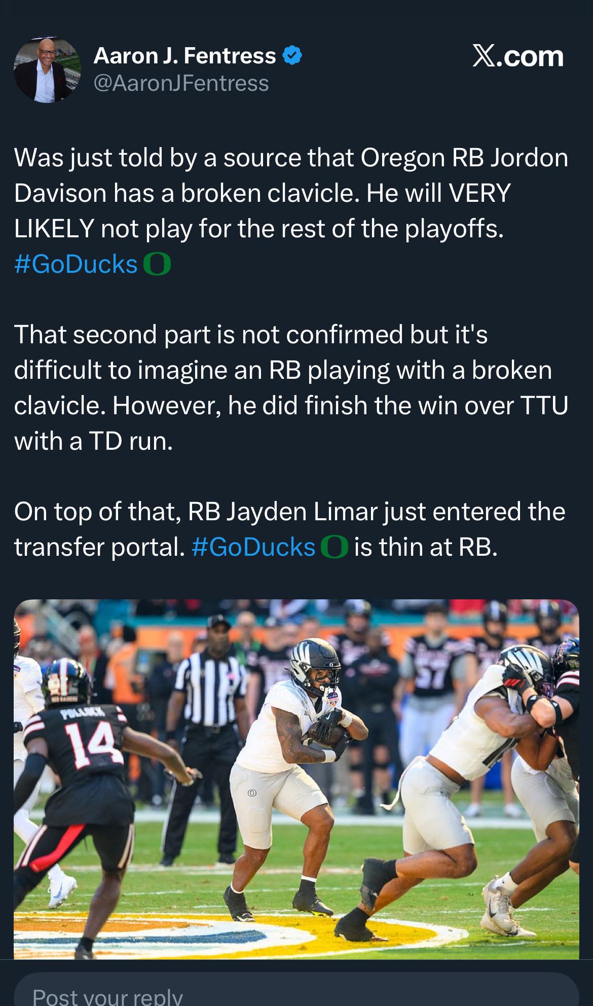Cig confirmed that Daley likely out for CFP. Hope he makes a speedy recovery. Enjoyed watching him play. Ndukwe will now get his opportunity.