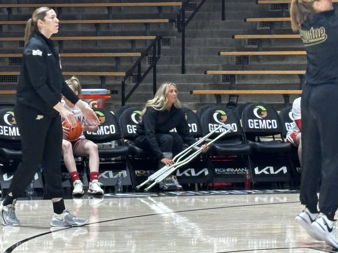 From Talia Goodman - Sydney Parrish just walked onto the court on crutches.