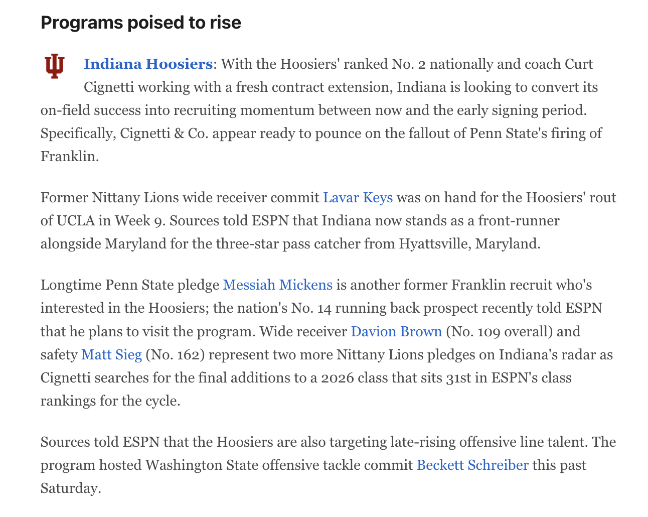 Like many here I have mixed feelings on ESPN's football recruitment analysis, but a piece recentl y came out, https://www.espn.com/college-football/recruiting/story/_/id/46758805/college-football-recruiting-rankings-update-coaching-change, that mentioned Indiana as a player for a handful of PSU flips - including Mickens Keys, and Sieg - as well as the OT from Wisconsin that is currently committed to WSU.