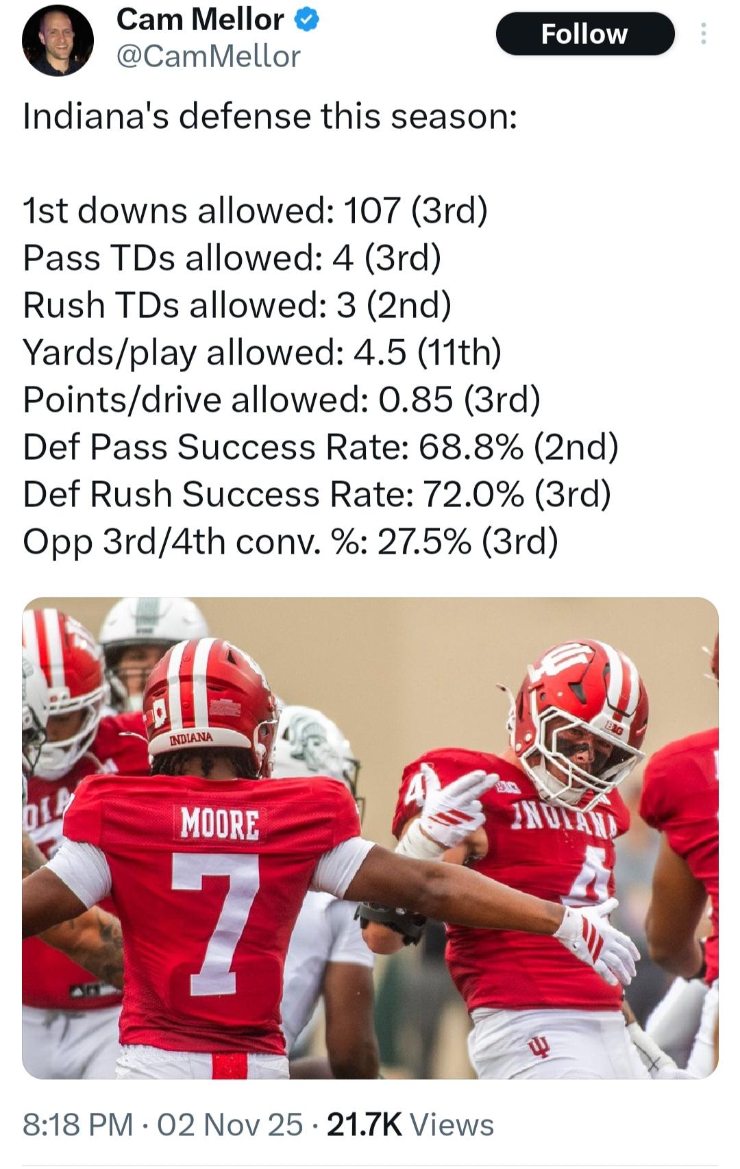 There is a correlation with Bob Bostad not being a Wisconsin coach. During his tenure there, every big boy O-line prospect became a Badger. They even stole Joe Tippman, starting Jets center, and from my high school, FWBD. Now that he’s the Hoosiers’ O-line coach the quality of athletes, the quality of performance, has improved dramatically. Wisconsin no longer has the talent to dominate the run game.