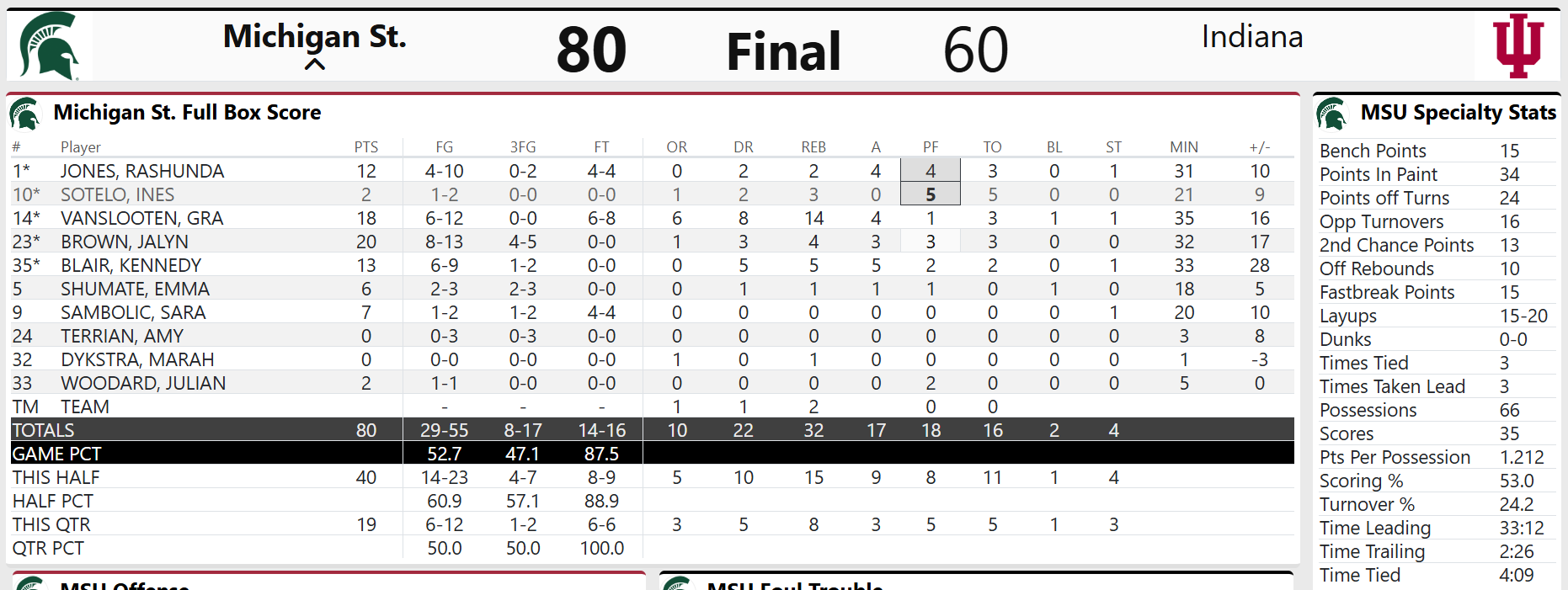 Class of '66 Old Fart Posted January 1 Author Posted January 1 After staying with the Spartans in the 1st half, we just didn't have the firepower to stay with them in the 2nd half. MSU shoots over 50% FG and 47% on 3s for the game vs 42% and 27% for us. Outrebounded again although we did do a better on our own board. Sadly, probably won't be a lot better outcome on Sunday at Maryland. A long season ahead for IUWBB. WayneFleekHoosier 1 Quote