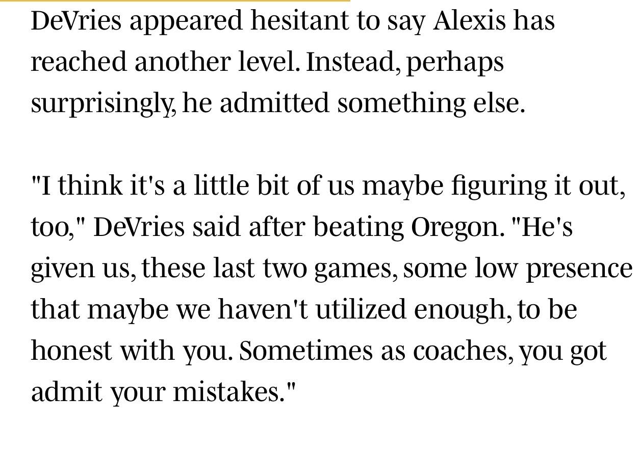 Artie86 Posted Friday at 12:19 AM Posted Friday at 12:19 AM I love this quote in a recent Sports Illustrated article interview of Coach DeVries….. Coach DeVries is completely transparent in his explanation and admits that he feels he and his coaches “messed up/overlooked” a player’s utilization,(Sam Alexis)…. He and his coaching staff worked together and made a change. Coach Woodson would have said, “ It’s my job and it’s on me to get these players ready to play better and get them over the hump….!” We all know this statement was repeated countless times after a poor performance followed up by the same results. HoosierHoopster, Banksyrules, iu eyedoc and 3 others 5 1 Quote